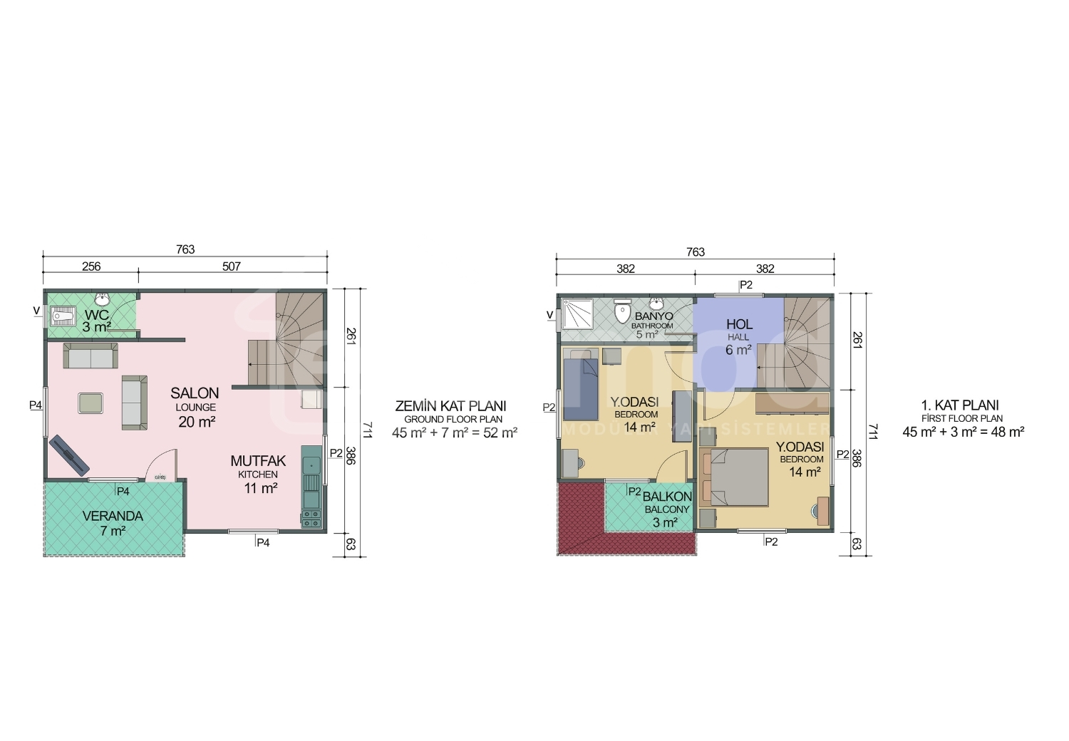 Ekstra fiyat farkı ile talep edilebilen özellikler; Duvar yüksekliği 280 cm veya 300 cm · Dış duvarlar ahşap desenli veya taş desenli kaplama · İç duvarlar alçıpan kaplama · İç duvar kalınlığı 10 cm · Pencere rengi kahverengi veya antrasit gri · Çatı kaplaması tek kat panel veya metal kiremit · Çatı izolasyon osb-membran veya osb-tyvek