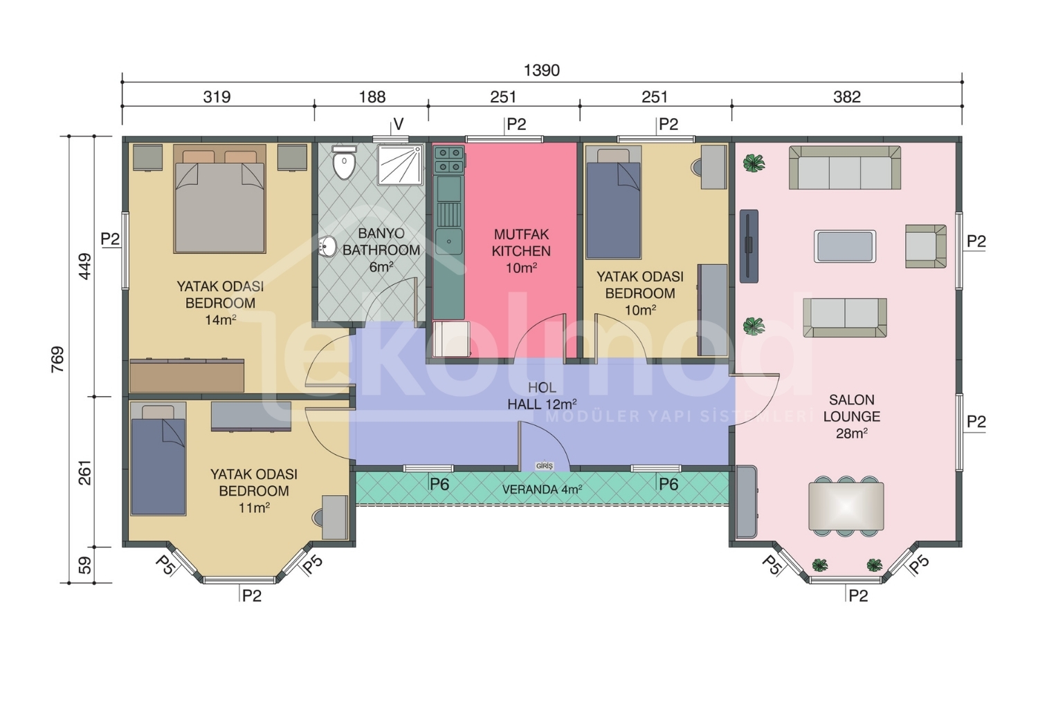 Ekstra fiyat farkı ile talep edilebilen özellikler; Duvar yüksekliği 280 cm veya 300 cm · Dış duvarlar ahşap desenli veya taş desenli kaplama · İç duvarlar alçıpan kaplama · İç duvar kalınlığı 10 cm · Pencere rengi kahverengi veya antrasit gri · Çatı kaplaması tek kat panel veya metal kiremit · Çatı izolasyon osb-membran veya osb-tyvek