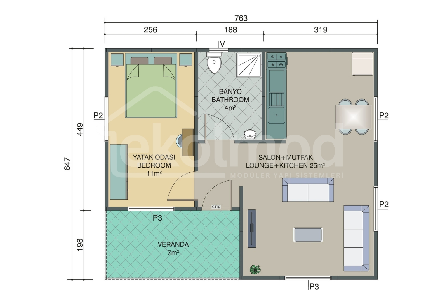 | Çatı Kaplaması | Boyalı Galvaniz Sac, Metal Kiremit (Opsiyonel), Shingle (Opsiyonel) |