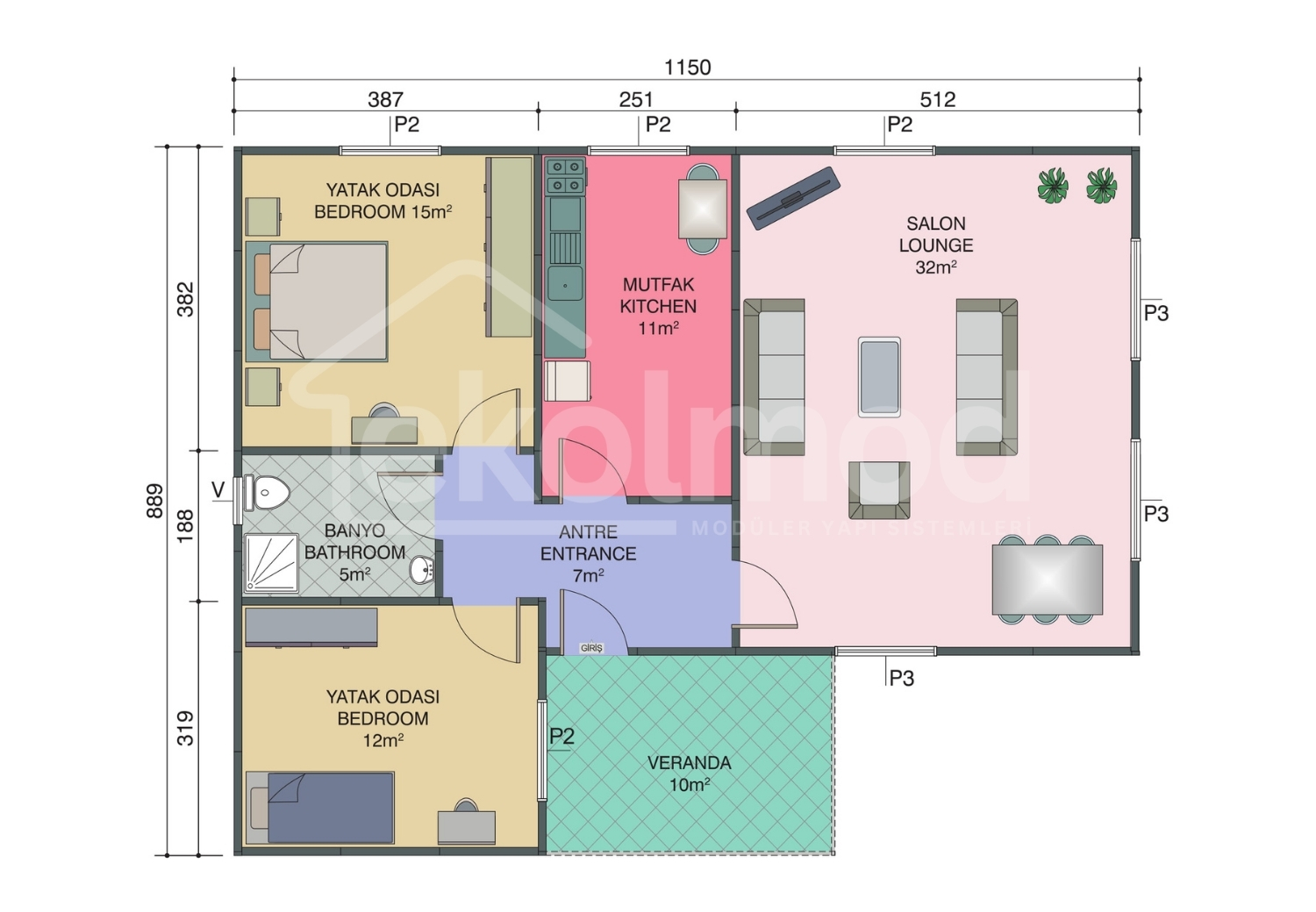 Zemin betonu, hafriyat, yer ve duvar kaplamaları (seramik, parke, fayans vb.), bina dışı bağlantılar (elektrik, su, pissu), belediye izinleri, ısıtma-soğutma sistemleri, nakliye ve montaj ekibinin konaklama/yemek masrafları müşteriye aittir.